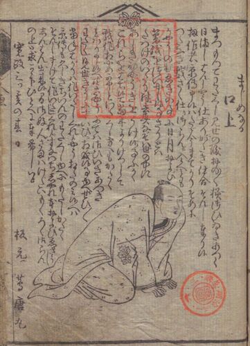 読んだ本 https://www.waseda.jp/enpaku/db/ イ14-00002-570 19(左頁) 中之巻ふくとくに あまみつ神の名をすぐに 天神ばしと行通ふ 所も神のおまへ町いとなむわざも紙見世に 紙屋治兵衛と名を付てちはやふる程かいにくる かみは正ぢきしやうばいは所がらな…