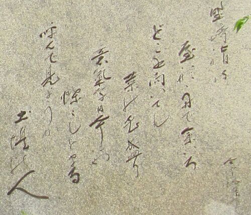 松乃木大明神にある猫塚は三味線に使われた猫を供養するため建立された。 写真だと分かりにくいがかなりでかい。 裏面を読んでみよう。 残さはや ちりし 桜の 花の匂ひ 一行目が読み難いので別角度で。 続け字で、残「さはや」だよね。 三行目「花」は「は」…